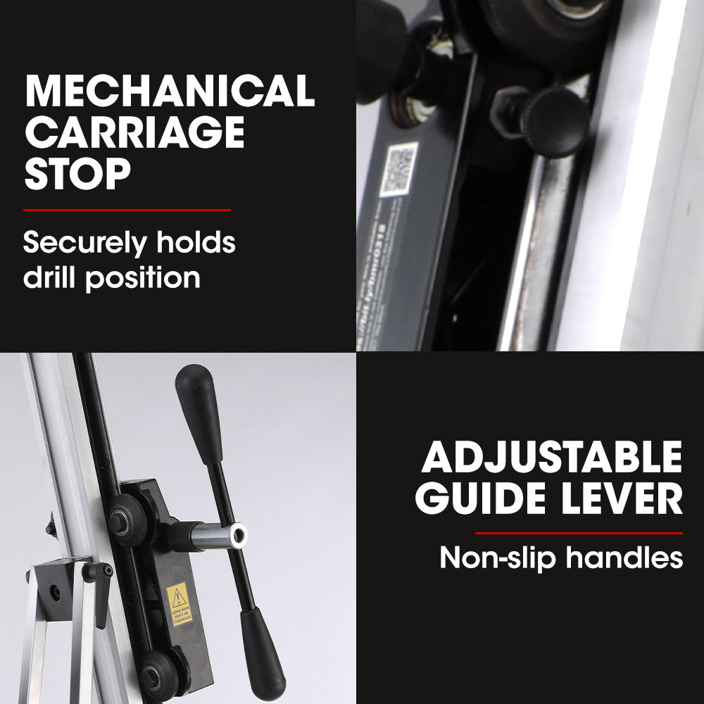 The Handle Is And Ambidextrous. Its Non-Slip Texture Ensures A Secure Grip Allowing For Precise Control And Reduced Fatigue During Extended Usage. The Tool-Free Angle Adjustment Precision Drill Carriage And Carriage Brake Make This Not Only Easy To Use But Also Provide Additional Safety And Protection For The Operator.