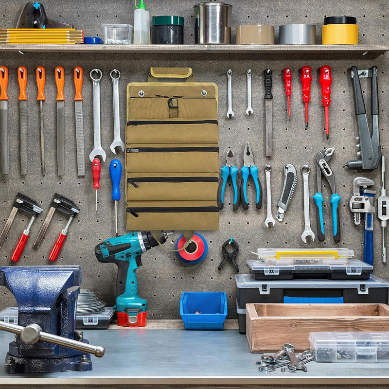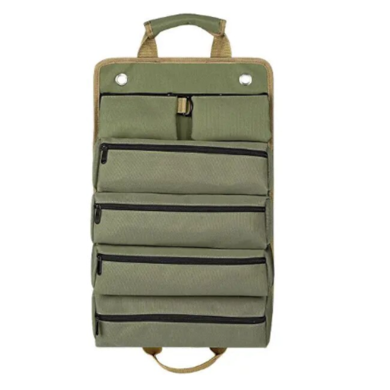 Product Description This 6-pocket multi-functional tool bag features 2 removable pockets and 4 large capacity pockets for storing various tools such as carpentry automotive and household tools camping and gardening. It can be folded and stored in a roll-type tool bag or unfolded and hung on a wall or car making it convenient for repairs. This large tool roll-up bag is made from 1000D Oxford fabric and heavy-duty materials rust-proof zippers quality straps buckles and a water grease rip-resistant fabric which is stronger and lighter than canvas. This will keep your tools safe in extreme work conditions. This roll-type tool bag is compact and easy to carry. It is easy to use and convenient to carry with a zipper 4 independent 3D inset pockets can hold various tools so you can use them in various situations such as automobile motorcycle camping gardening etc.