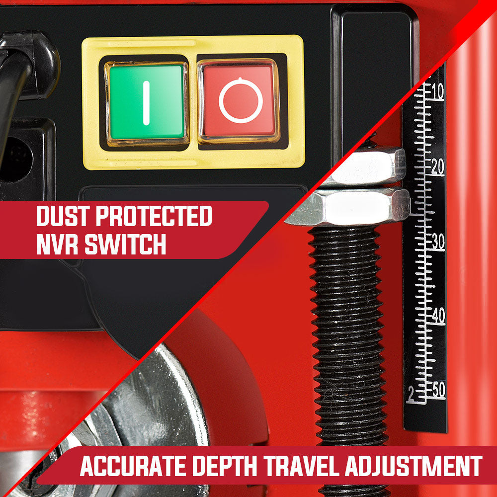 The DP13 Series II has been designed with smooth powerful and consistent drilling in front of mind. Its 50mm depth drill travel is accompanied by a sturdy height work table accommodating the various types of objects to be drilled and the precision required. Moreover the work table is also angle to 45 in either direction. The three spoke handle works in harmony with the rack and pinion spindle feed to produce a clean and fluid press. The removable chuck guard offers user protection and is also designed to be set out of the way for exposed drilling. For further protection the DP13 Series II also comes fitted with dust protected NVR switches so no restart will occur once power is restored in the event of an outage.
