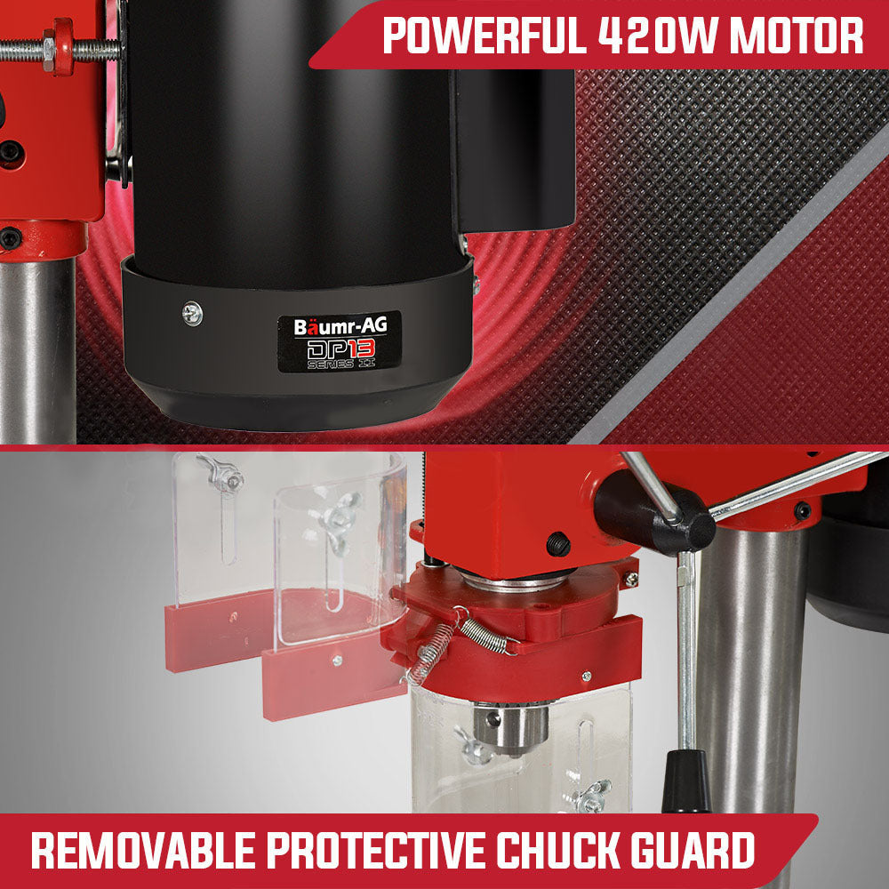 The NEW Baumr-AG DP13 Series II Bench Drill Press is the cornerstone addition to any workshop. Featuring nine speed variable RPM settings a 13mm solid stainless steel chuck and a powerful 420W motor this bench mounted unit offers the torque components and versatility required to execute a range of drilling tasks through a whole host of materials.