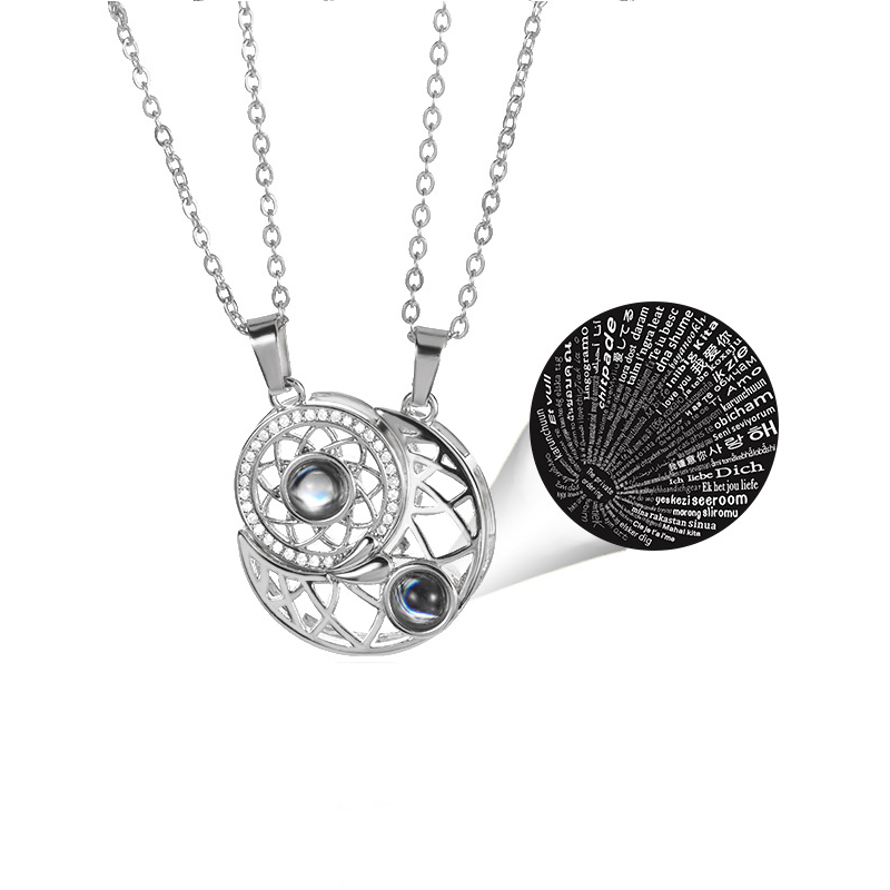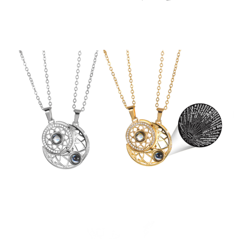 These couple's necklaces make a great gift idea not only because the sun and moon fit together but the projection of I Love You's in 100 languages!