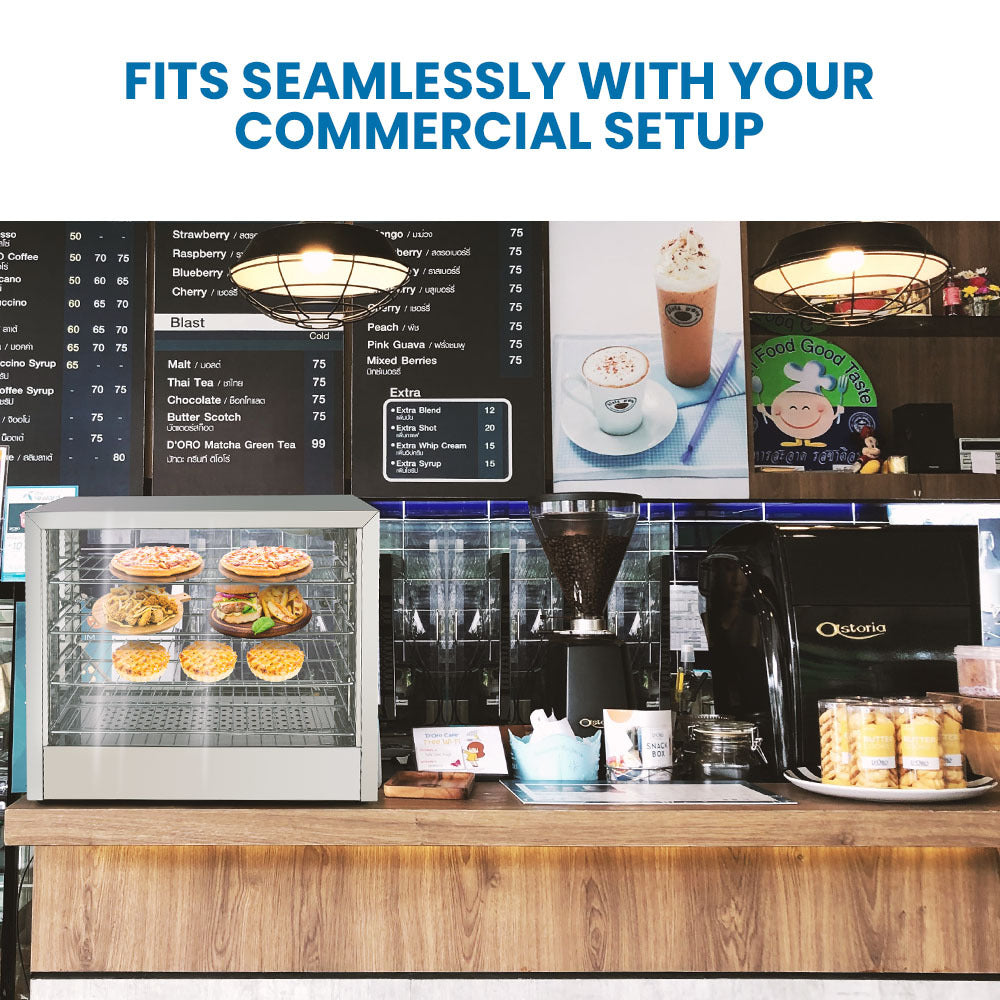 The Eurochef Has All The Features You Need To Keep Up With Demand. Heat Resistant Handles On The Sliding Glass Doors Ensure Easy Access For Staff Throughout The Day. The Four Large 57X30cm Removal Stainless Steel Shelves Are Easy To Clean And Provide Plenty Of Space For All Of Your Food Products. This Eurochef Food Warmer Display Is The Perfect Choice For Cafes Bakeries Food Stands And Other Food Vendors That Need To Keep Food Presentable And Ready To Serve.
