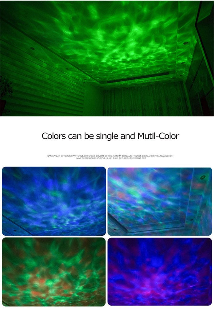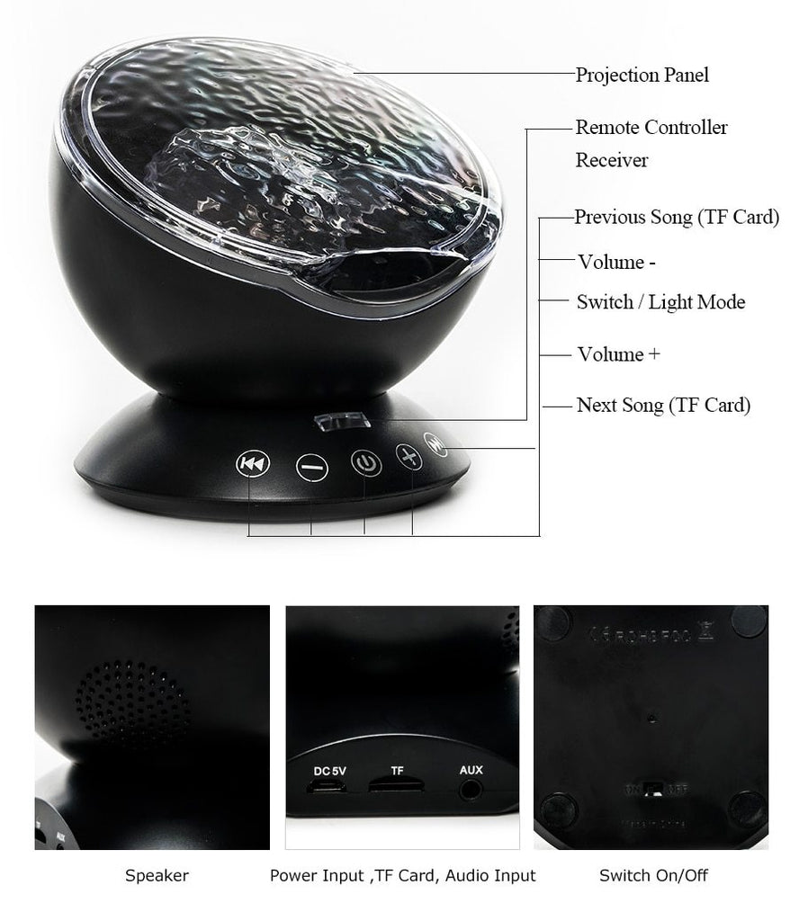 The Ocean Mood Light Is A Music Lamp Atmospheric Projector Card Readable And Sound All-In-One Device. The 12 High-End Ultra-Bright Built-In Led Large-Sized Chip Beads (4 Red Beads 4 Blue Beads 4 Green Beads) Allow A Wider Protected Area Clearer Projection And Longer Durability. The 7 Colour Changing Modes Create An Of Flowing Waves.