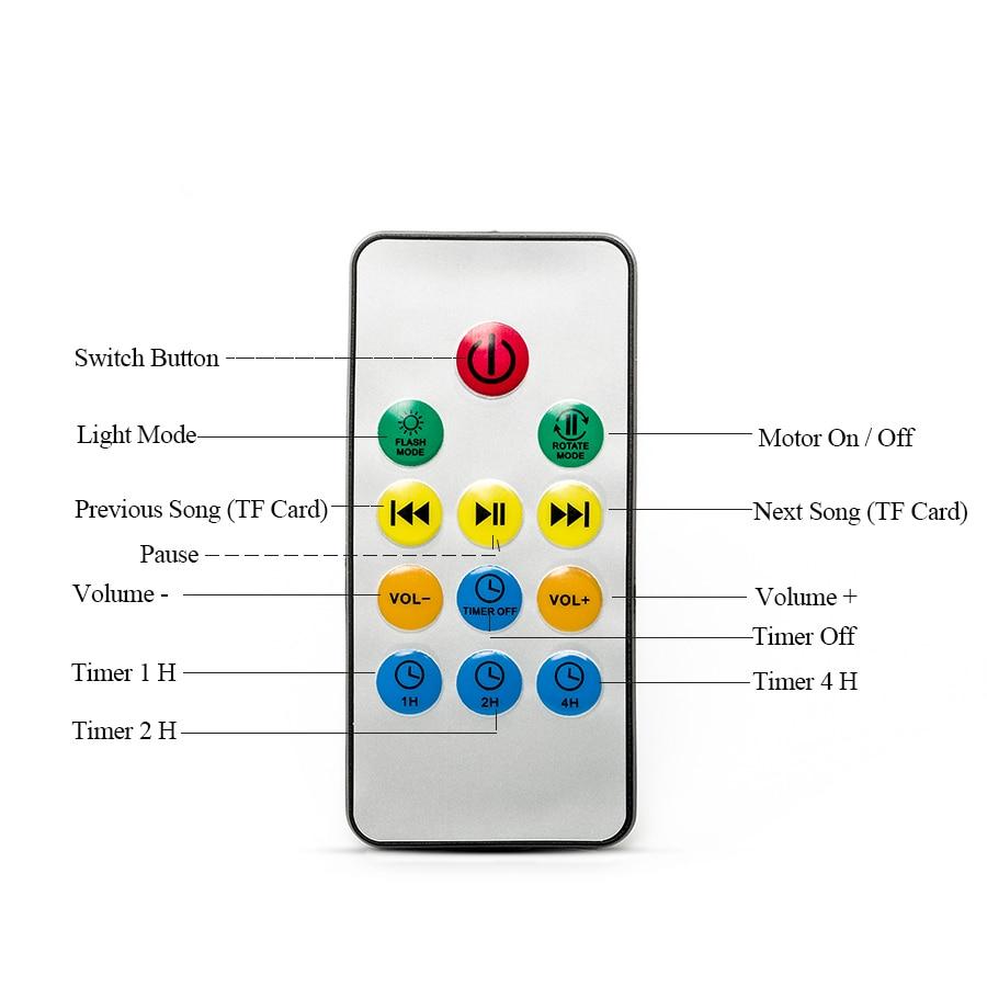 The Power Key Is The On/Off Switch And Light Mode Switch Key. Press And Hold The Key For 3 Seconds To Start. Touch It To Select One Of The Seven Light Modes. Press And Hold The Key For 3 Seconds For Shutdown. The + And - Buttons Are Volume Buttons. The Projector Has Built-In Hypnotic Music. Under Low Volume After Start-Up Users May Press The + Button To Switch For The Next Song. This Feature Is Only Available When A Tf Card Is Inserted