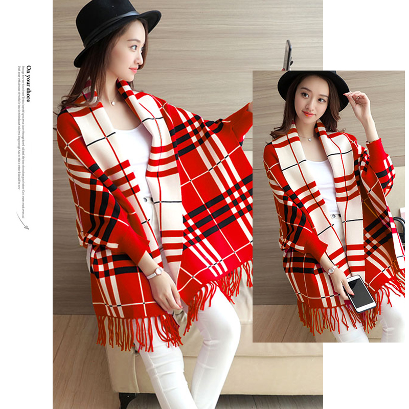 Chequered Shawl Poncho Batwing Sleeve Coat Fringed Autumn Winter Scarf Red Scarves & Wraps